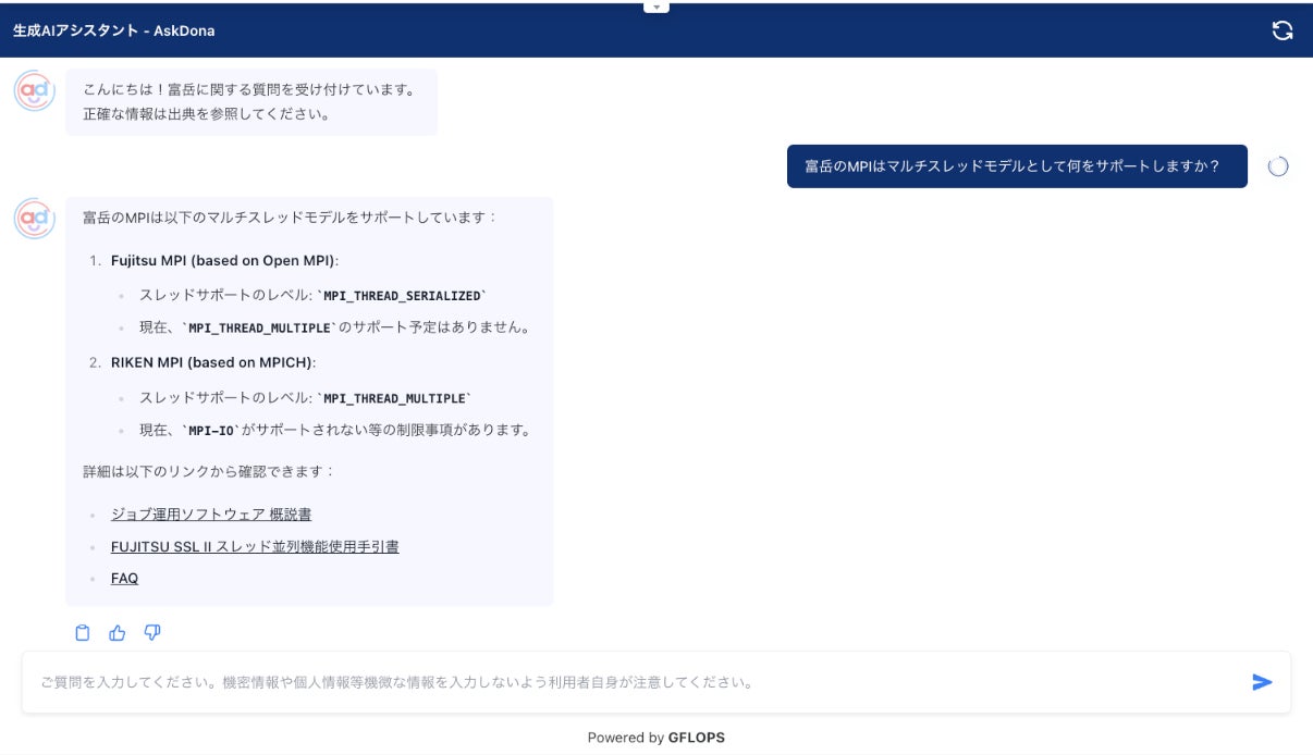 AskDona導入背景富岳サポートサイトは、「富岳」の国内外の利用者に対して技術的な支援を提供しています。利用者に向けて技術情報を網羅的に提供することが重要な一方で、利用者にとっては情報量の膨大さと相まって、各種フォーマットで作成された多数の技術文書の中から必要な情報を探し出して問題解決を図ることが容易でない場面があります。高機能検索サービスと質問に対する高精度自動回答サービスの提供を通して、利用者による問題の自己解決を促進することが富岳サポートサイトにおける直近の課題となっていました。こうした状況の中、ジャフコの起業支援プログラム「First Leap」※2のサポートの一貫として、理研とGFLOPSが生成AIに関する技術意見交換を行い、これをきっかけにAskDonaの導入について議論が始まりました。約半年間にわたる検証と評価の過程を経て、AskDonaによるソリューションが高い評価を受けて導入が決定されました。AskDona導入目的富岳サポートサイトのFAQページなどの充実化を目指す中で、急速に発展が進む生成AI技術を用いた質問回答システムについての有効性を活かし、回答内容をチャットサービス形式で利用者へ提供するリアルタイムサービスを実現します。その回答内容は、AskDonaの基盤となる生成AIの応用技術を適用した検索拡張生成(RAG)※3に「富岳」のマニュアル等を学習させることで、「富岳」利用者のそれぞれのニーズに合わせた最適なものとなります。
